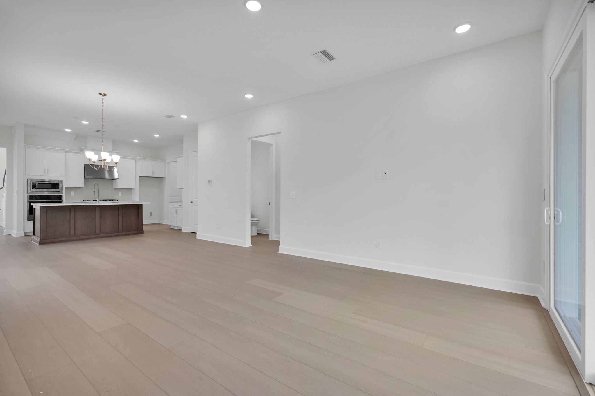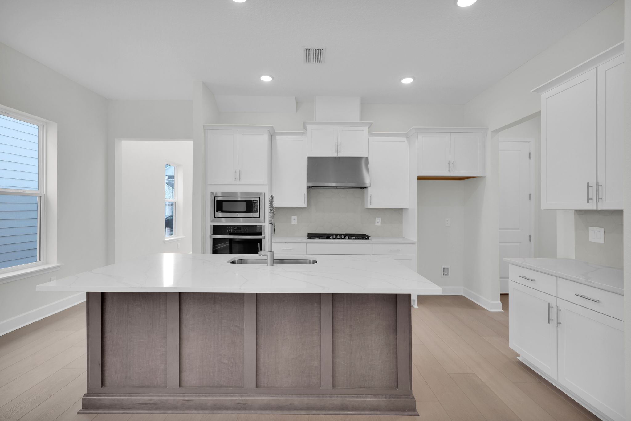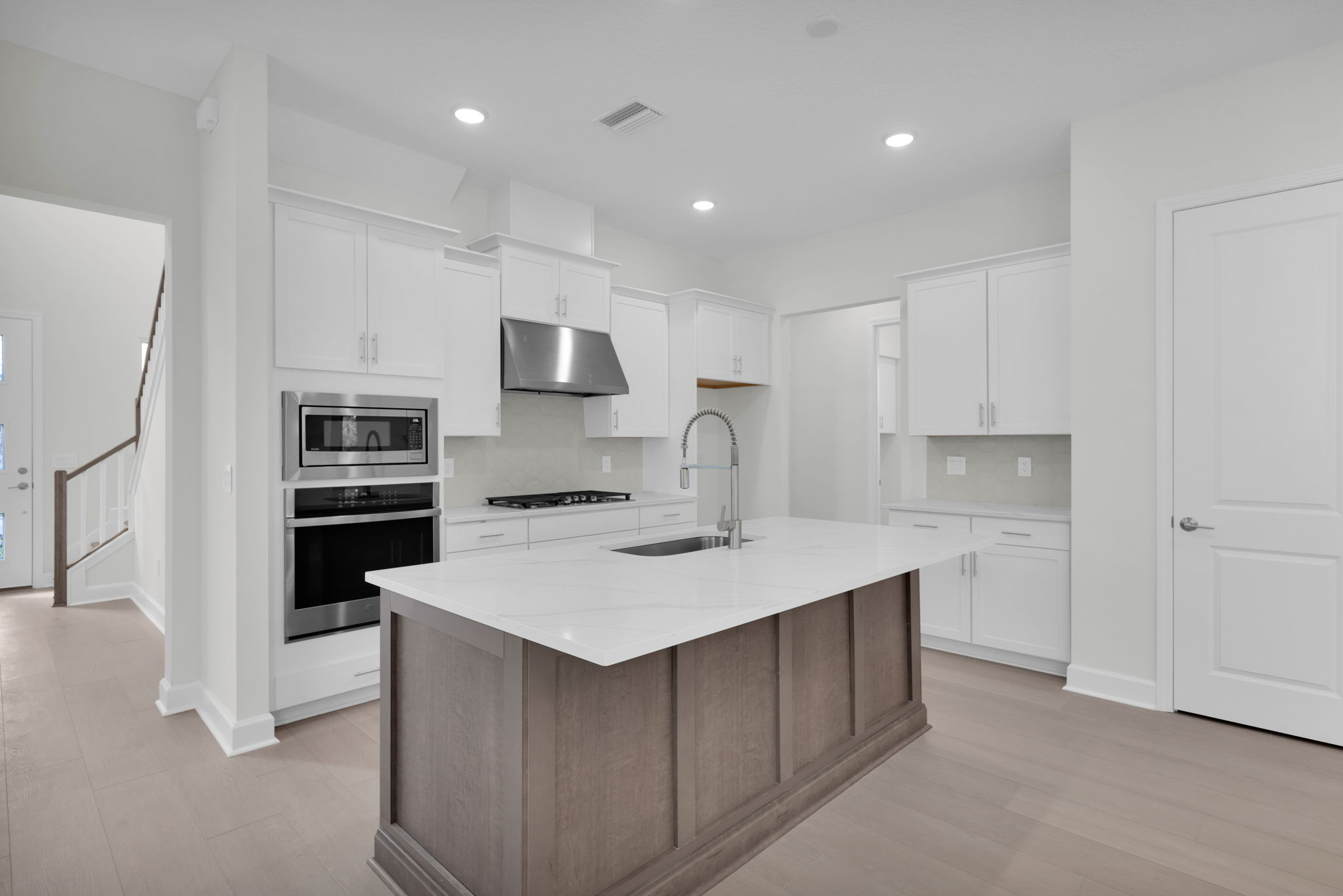 The first floor features a gourmet kitchen with upgraded cabinetry, quartz countertops, GE Profile stainless steel appliances, a 36" gas cooktop, a wall oven, a commercial-style vent hood, and crown molding. The open-concept layout connects the kitchen, café, and family room, with luxury vinyl plank flooring and a 12’ sliding glass door leading to the covered patio with light grey brick pavers.
